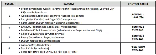 Tahmini proje kontrol tarihleri aşağıdaki kapsamı ile verilmiştir. Her bir kontrolde kapsamdaki hesaplamalar